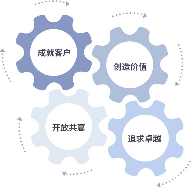 成就客户是一切决策的出发点,,创造价值是衡量所有工作的标准,,追求卓越是我们做事做人的态度,,开放共赢是我们的格局也是最终的结果。。。价值观的齿轮环环相扣,,,,推动着组织里的每个人不断向前。。。。